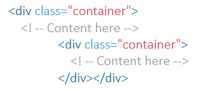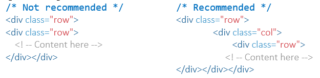 - Never use a .row class as a direct child of another .row class as the .row class has negative margins, like: