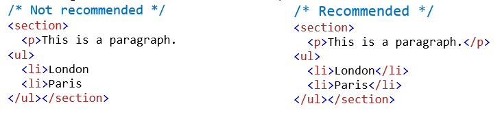 - Close all HTML tags: In HTML, you do not have to close all elements (for example the <p> element). However, we recommend closing all HTML elements to avoid future nesting issues and better code readability: