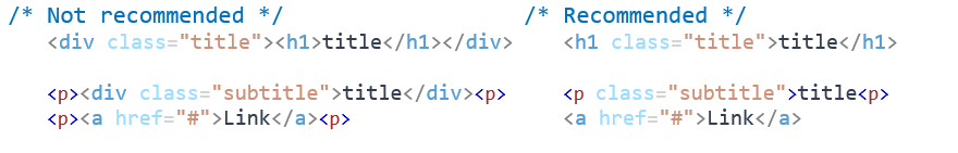 - Wrapping extra elements: One should not wrap unnecessary tag around other tags. That can break code in some browsers and is not a recommended practice. Few examples: