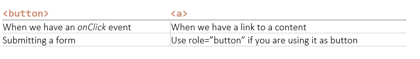 - <a> vs <button>: There is a lot of confusion as to when use <a> tag and when to use the tag the semantic way. Following are few use cases when to use what: