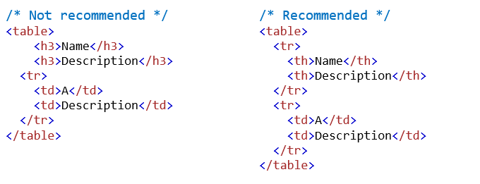 - Tables: Tables can be difficult to deal with at times if not written properly. As a standard practice one should write column elements <td> <th> inside a row element only <tr> </tr>. Also, every element should be inside a column. Below are few examples: