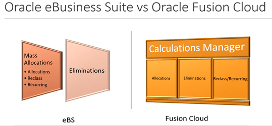 Allocations and Eliminations in EBS have specific allocation and elimination templates within the general ledger application, which handles these two functionalities separately. In Oracle Fusion Cloud, it’s the Oracle EPM technology embedded throughout the Oracle cloud applications used. In addition, a tool called “Calculations Manager” is leveraged using Oracle Essbase. It provides an allocation template that differs from Oracle EBS and a formula template, an alternative method of defining allocations or eliminations.
