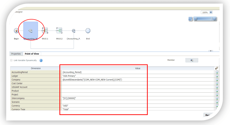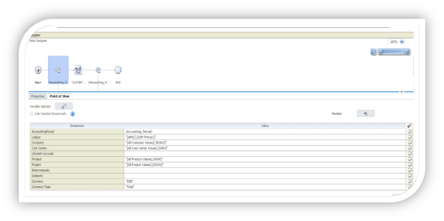 The first step after the Begin icon is the Main Point of View (POV). There is also a POV section in the allocation component itself. For a simple rule, you can use the main POV to select the values you want to be fixed, meaning there is no need to enter the same values in the other parts of the allocation template. You can still do the same for complex rules, but remember that fixed discounts will apply to all allocation components or blocks. In this example, there is a variable component for the accounting period. This means you can select the period you want to run for the allocation rule at run-time.