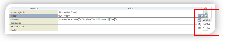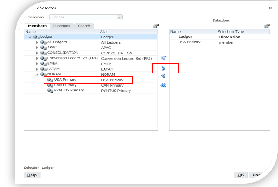 Click on the member selector icon located on the right side. From the list, select Member. When the member selector opens, select the dimension value from the left side, and click the arrow fitting symbol to move the dimension value to the right side. Finally, click OK to accept the deal.