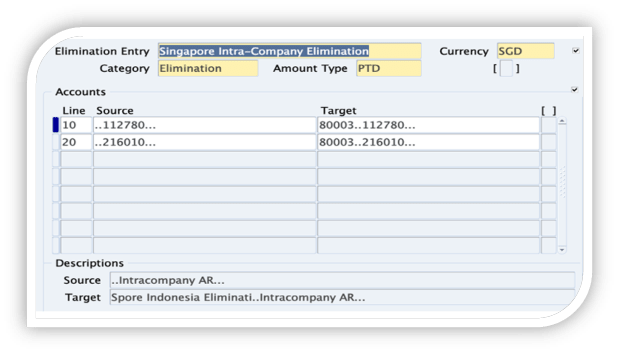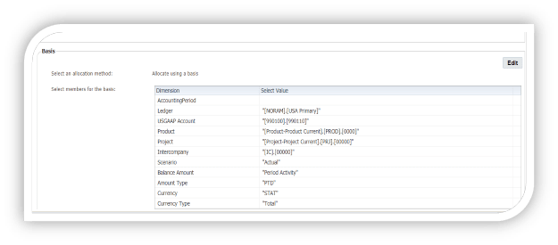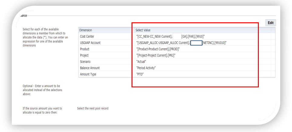 In this section, notice that the other dimensions with the values populated in the POV are no longer showing up. Instead, enter the dimension values from which the GL Balances will be aggregated and allocated (In EBS, this is your “A” line).