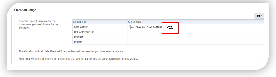 This is where you tell the system the dimension you want to allocate (or loop as in EBS). In this example, the allocation range is the cost center dimension. In the background, the calculation manager uses the values populated here as part of the “Target” and “Basis.”