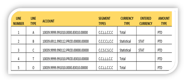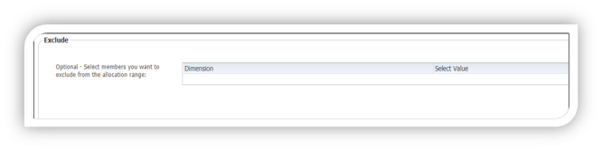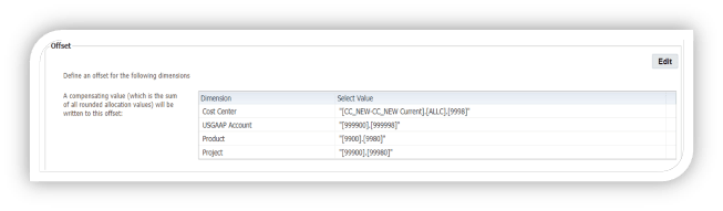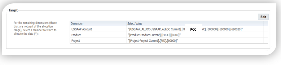 Notice that the dimension populated in the allocation range (i.e., cost center) is not included here. Instead, this section should contain the target dimension values to which the GL balances from the Source section will be allocated. In EBS, this is the “T” line.
