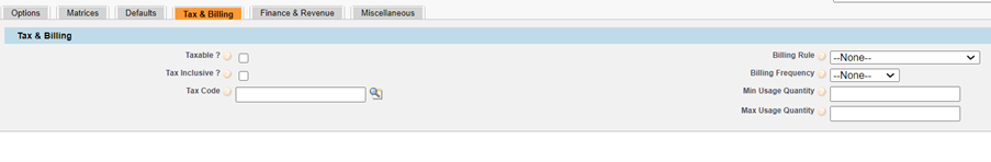 You can configure all Usage, Billing, and Tax-related information for your Product from the Tax & Billing tab.