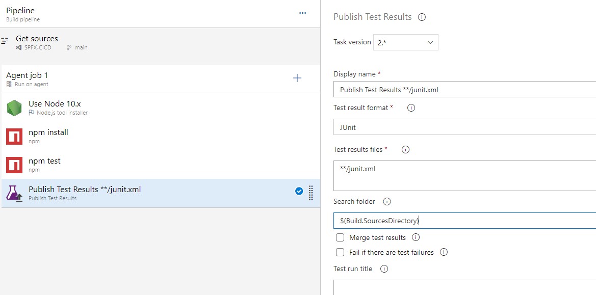 In order to get test results information attached with the build results we need to import these test results from test runner into Azure DevOps. Now Add a new task as Publish Test Results. update the Test results files field to **/junit.xml and the search folder to $(Build.SourceDirectory).