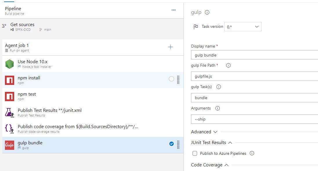 We first need to bundle our solution in order to get static assets that can be understood by a web browser. add another gulp task, set the gulp file path ,set the Gulp Tasks field to bundle and add -- ship in the arguments.