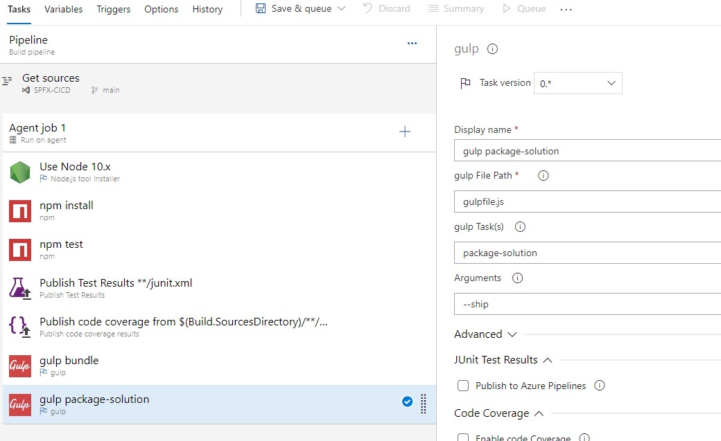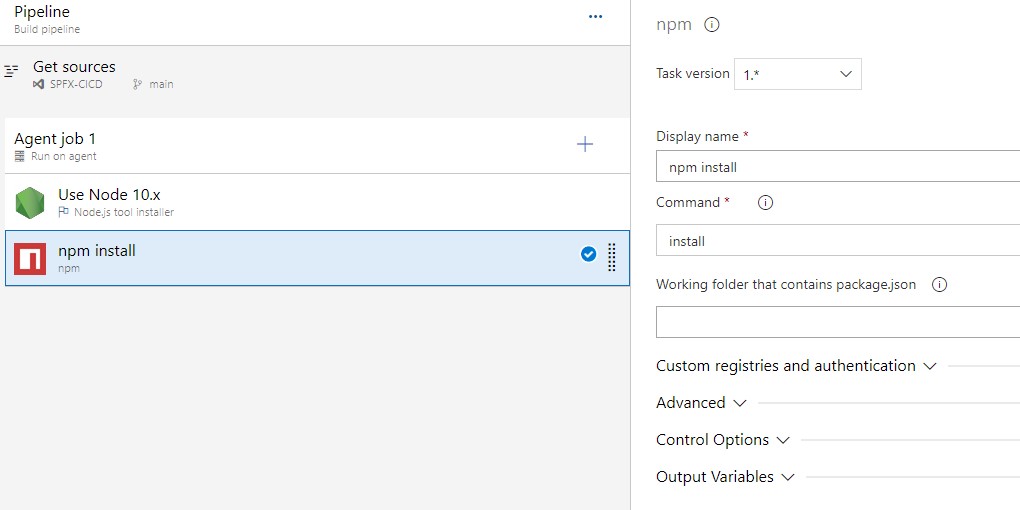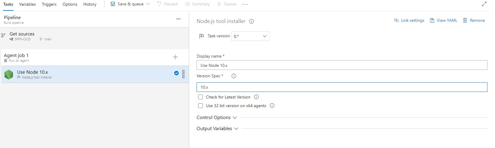Once build definition has been created, the first thing we need to do install NodeJS. Make sure to install version 10 (current using version), as SharePoint Framework depends on it.
