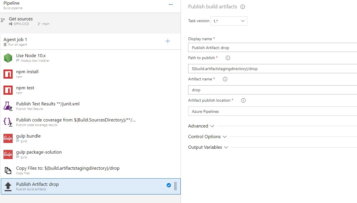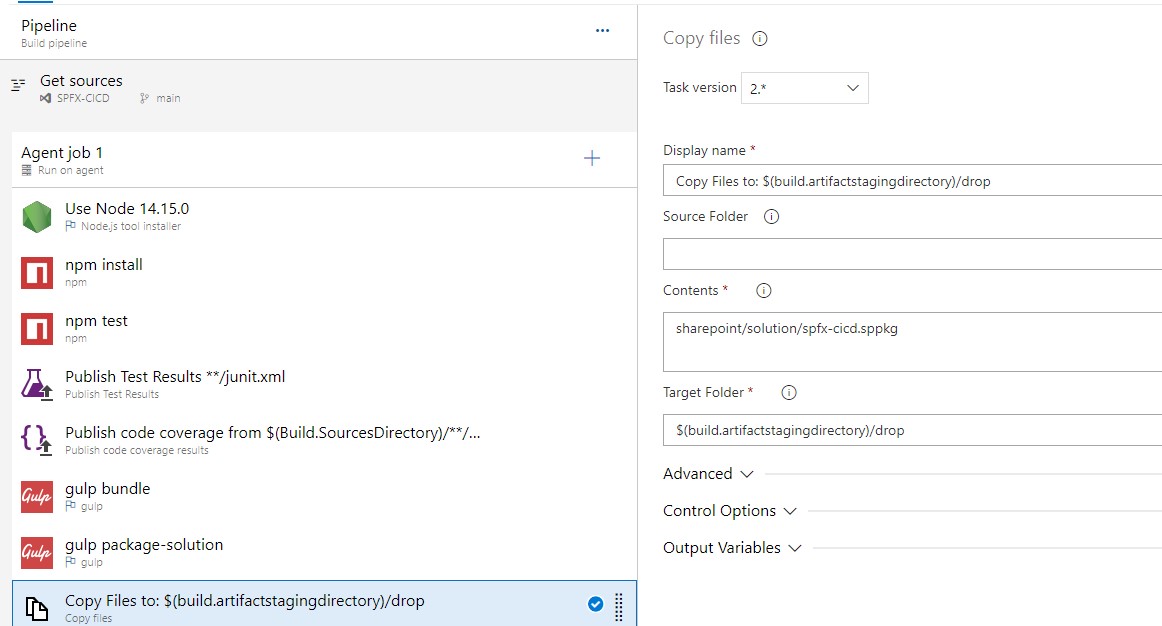 Add a Copy Files task and set the Contents to **\*.sppkg[ex: sharepoint/solution/spfx-cicd.sppkg](the SharePoint package is created with the previous task) and the target folder to $(build.artifactsstagingdirectory)/drop.