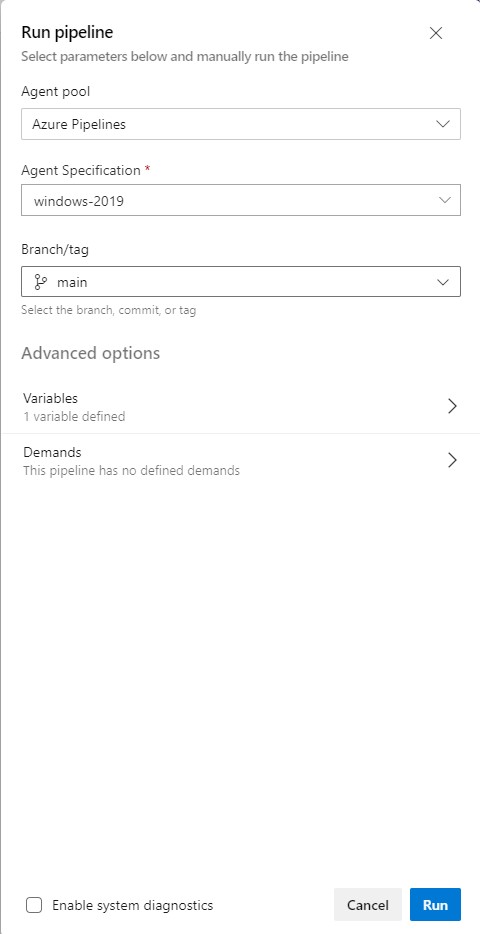 Now select the pipeline and run the pipeline. Where we can see different options to choose as below. Here I am running the pipeline with ubuntu agent.