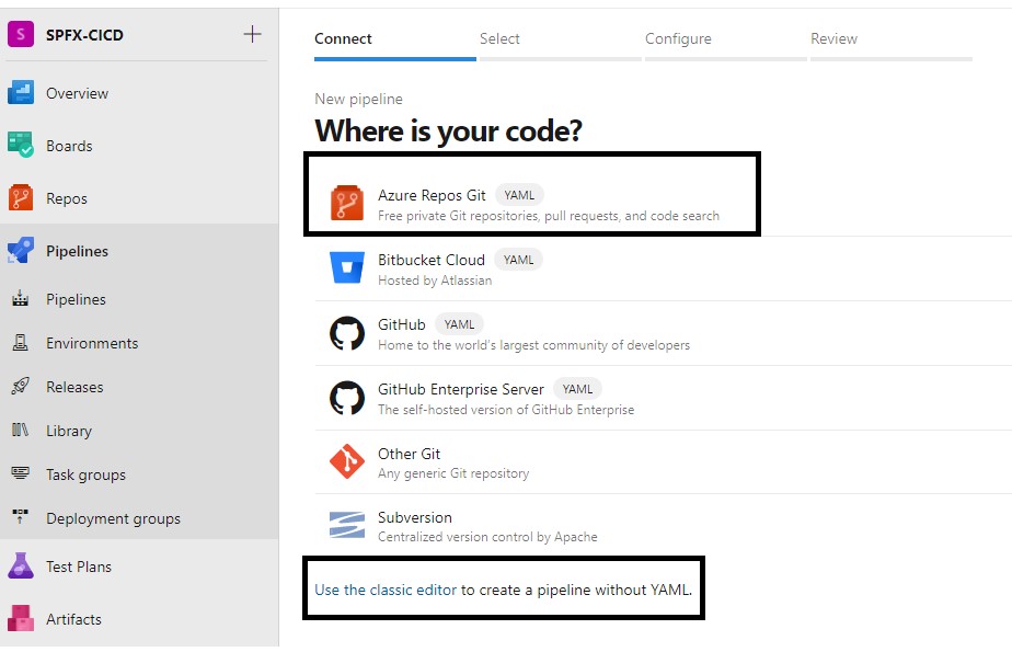 Select the Repository to build the pipeline and here we will have 2 options to create new pipeline with YAML code and another one with using classic editor (PS: Here I am using classic editor to create the build pipeline).