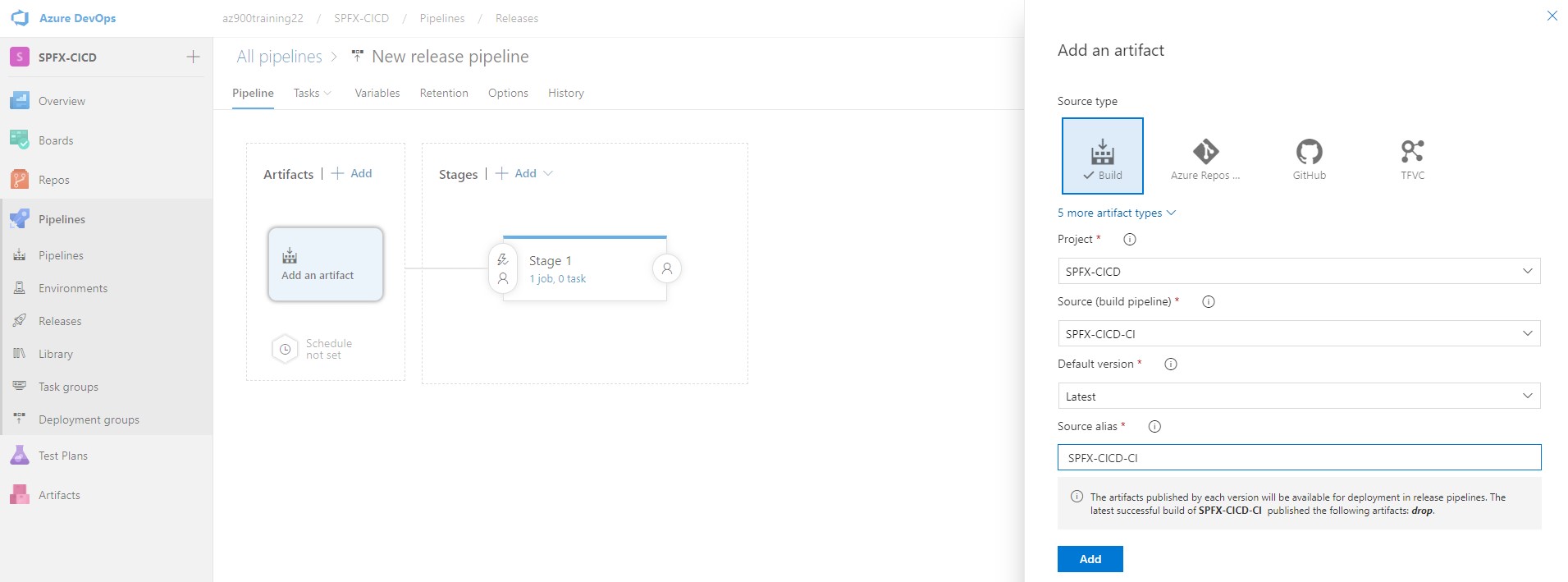 Click on add an artifact text and then select the build definition which we previously created.