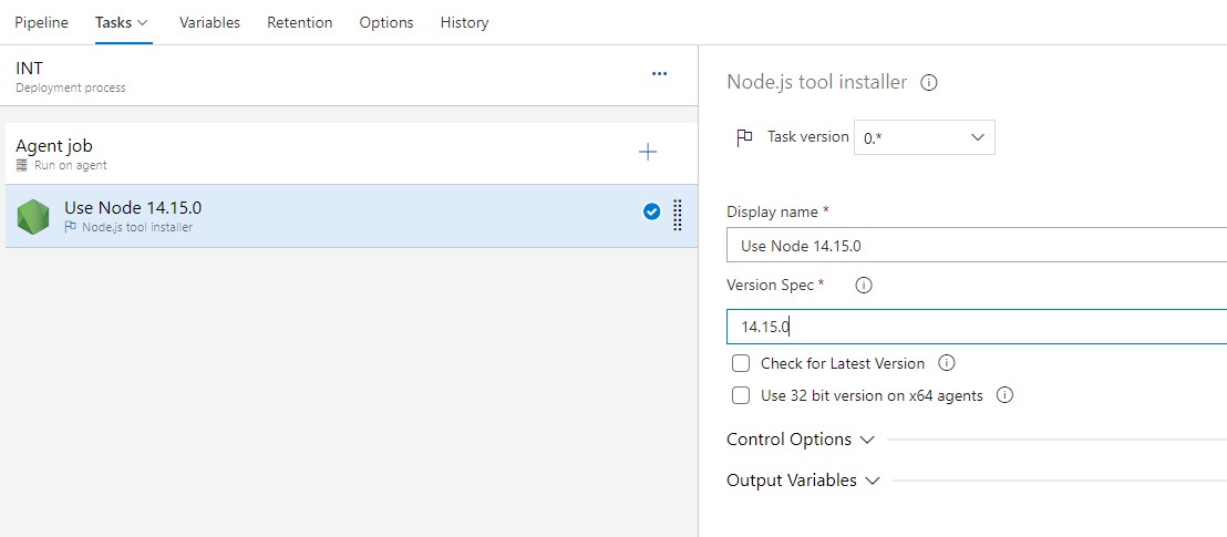 First step we are deploying Int Environment, click on 1 job 0 task so that we can access the tasks configuration view. which is same as build definition. Add the Node tool installer task and define 10.X (relevant version) in the version spec field.