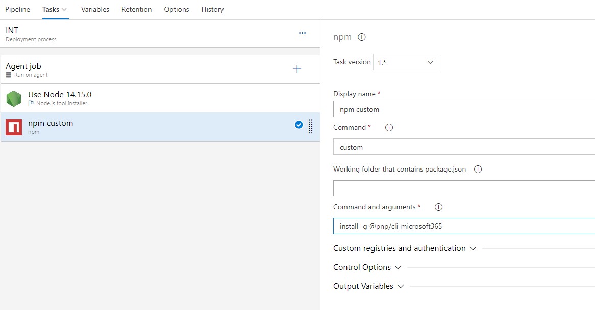 Add a npm task, select a custom command and type install -g @pnp/cli-mcrosoft365 in the command and argument field.