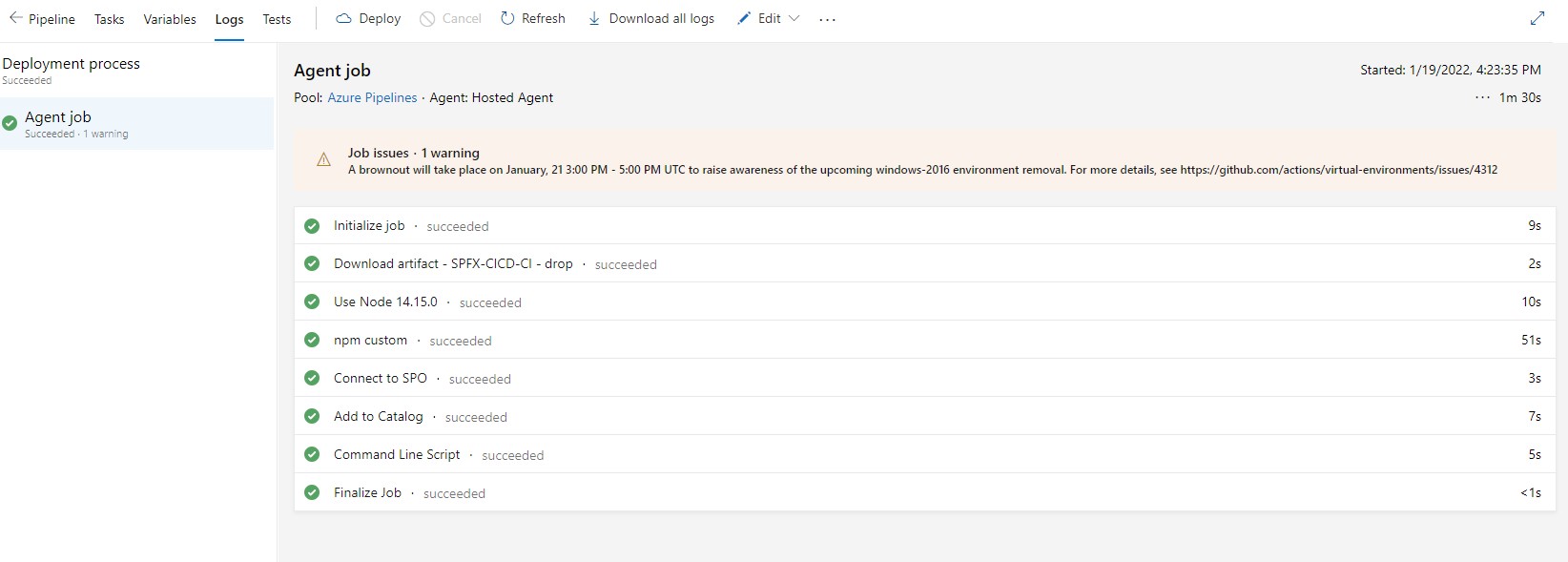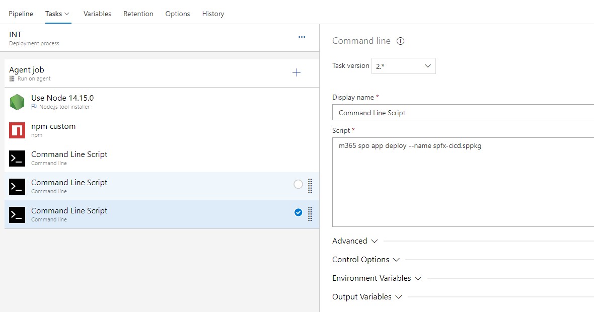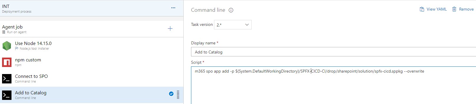m365 spo app add -p $(System.DefaultWorkingDirectory)/SpFxDevOps/drop/SharePoint/solution/sp-fx-devops.sppkg –overwrite ( It will change based on your directory)