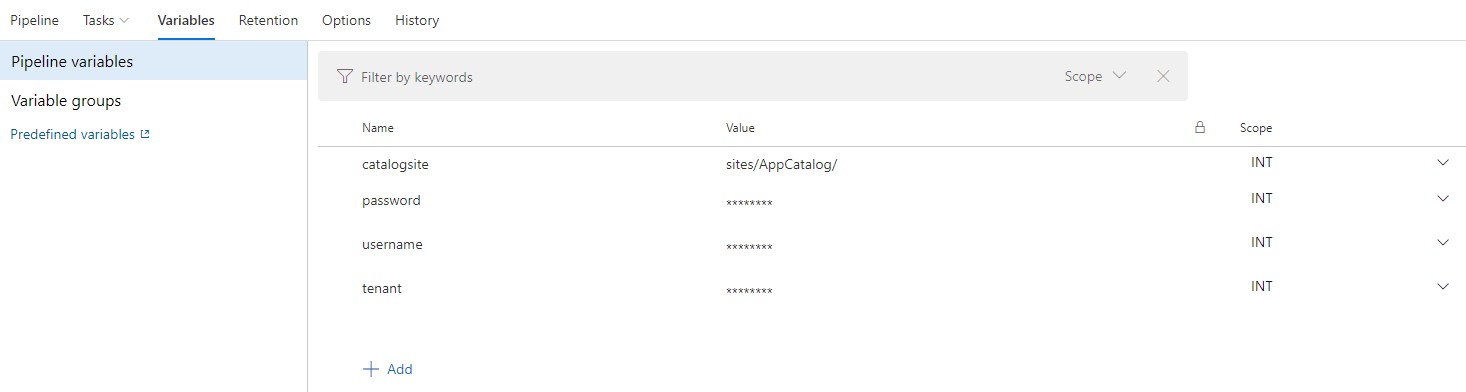 The tasks we configured in the last step rely on Azure DevOps process variable. We need to define those variables before being able to run the build definition.