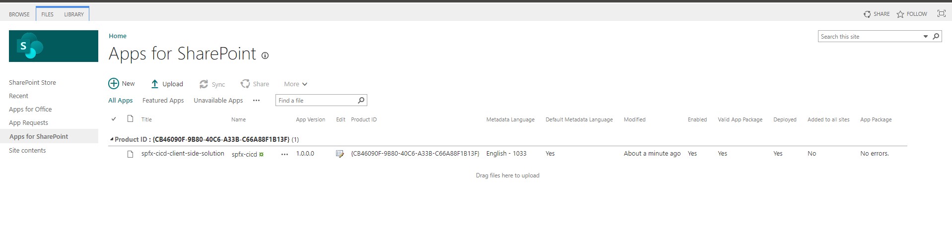 The final step in the setup is to deploy the application to the App Catalog to make it available to all site collections within the tenant as its latest version.