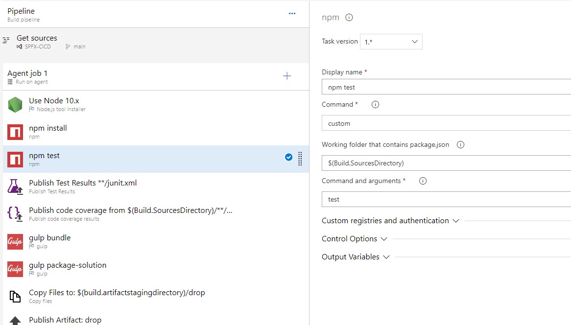 Update the command to custom and custom command field, enter test. Then update the working directory option to $(Build.SourceDirectory)