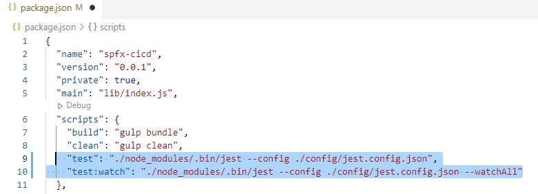 Next need to configure project level to leverage jest when typing commands. now edit the package.json file and add/replace the below scripts.