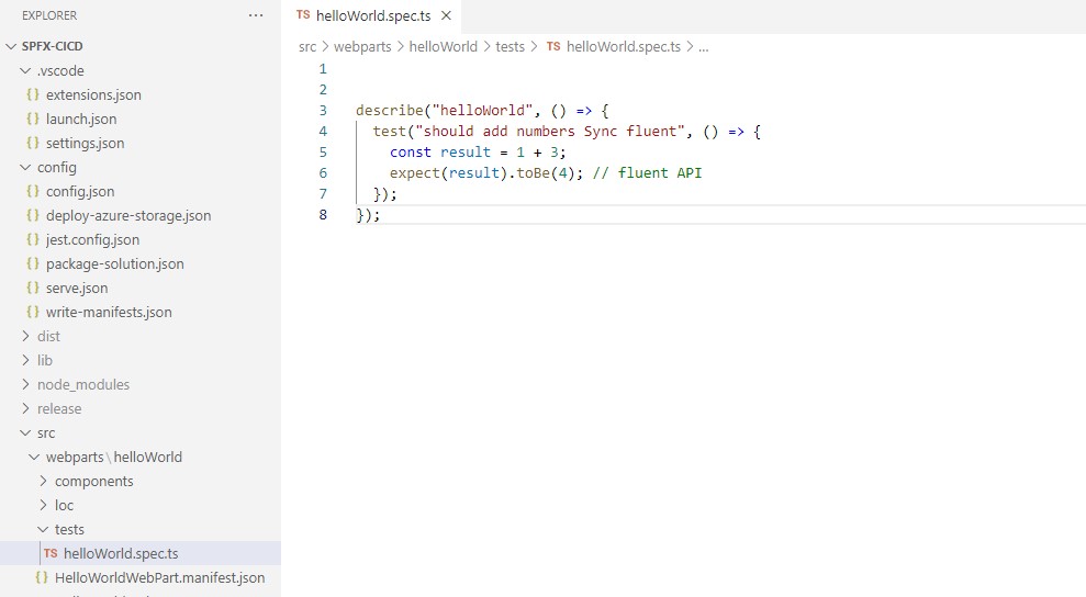 Now we need to create a new file ex: src/webparts/webPartName/tests/webPartName.spec.ts and add the below code this will helps to write a unit test