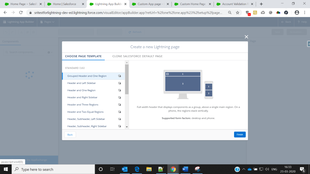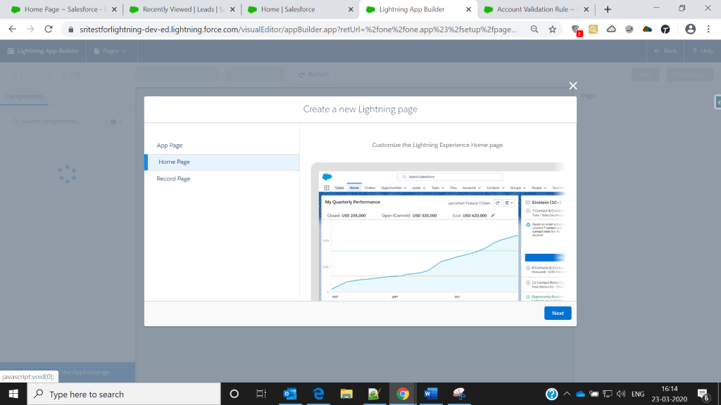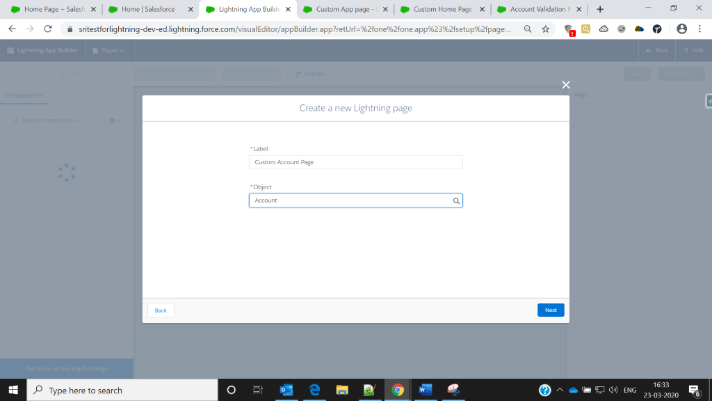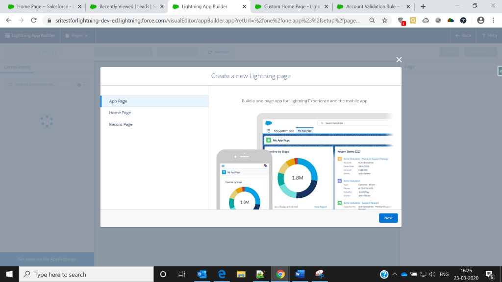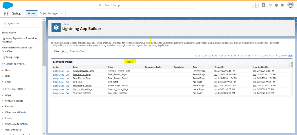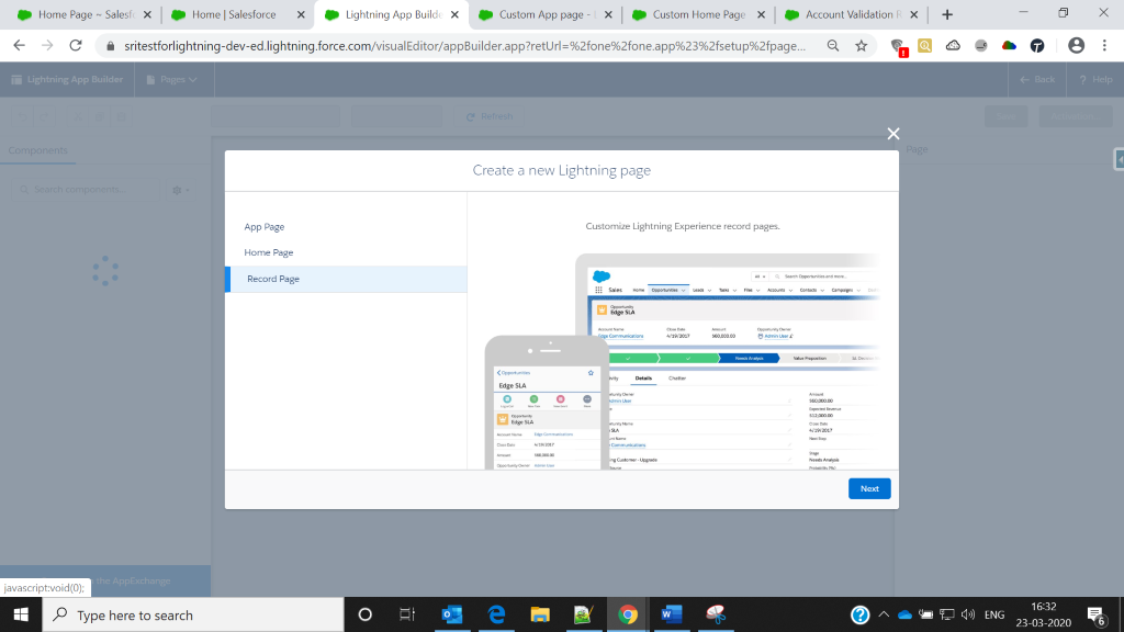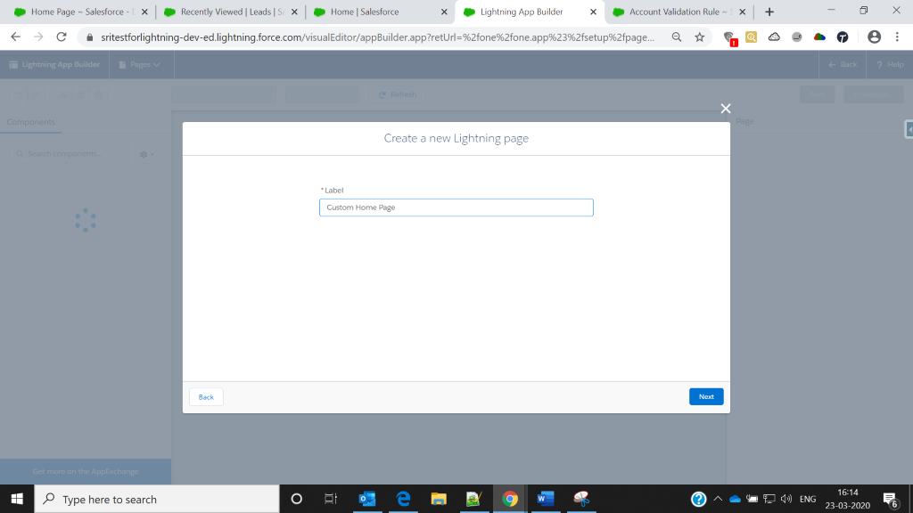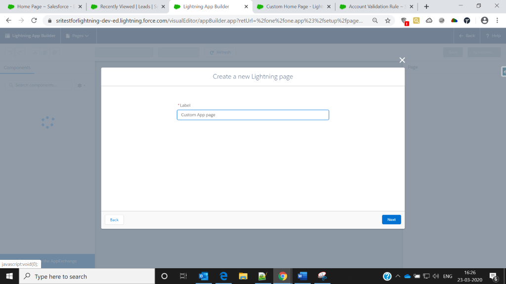 - Click on New, will be redirected to ‘Create a new Lightning Page’ popup.