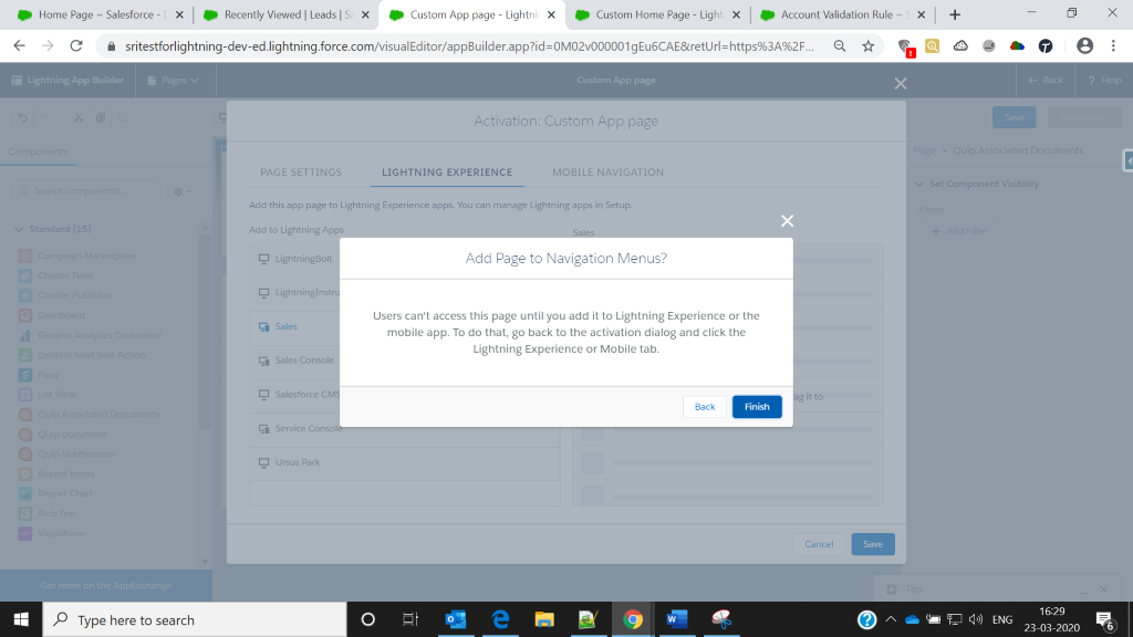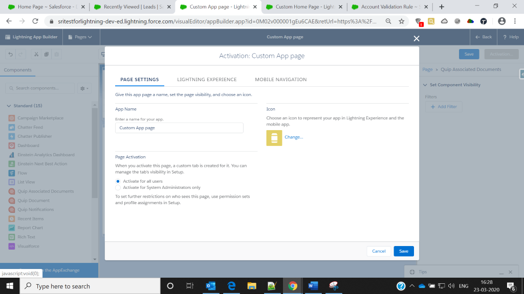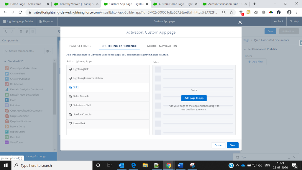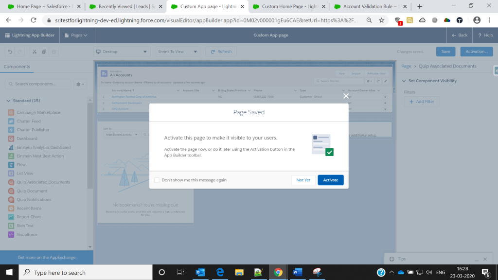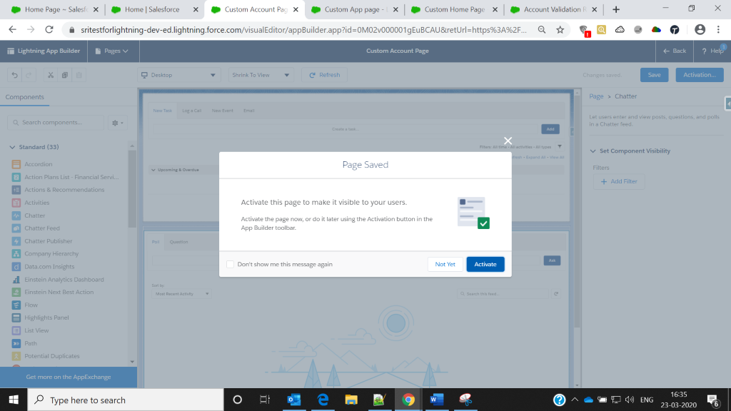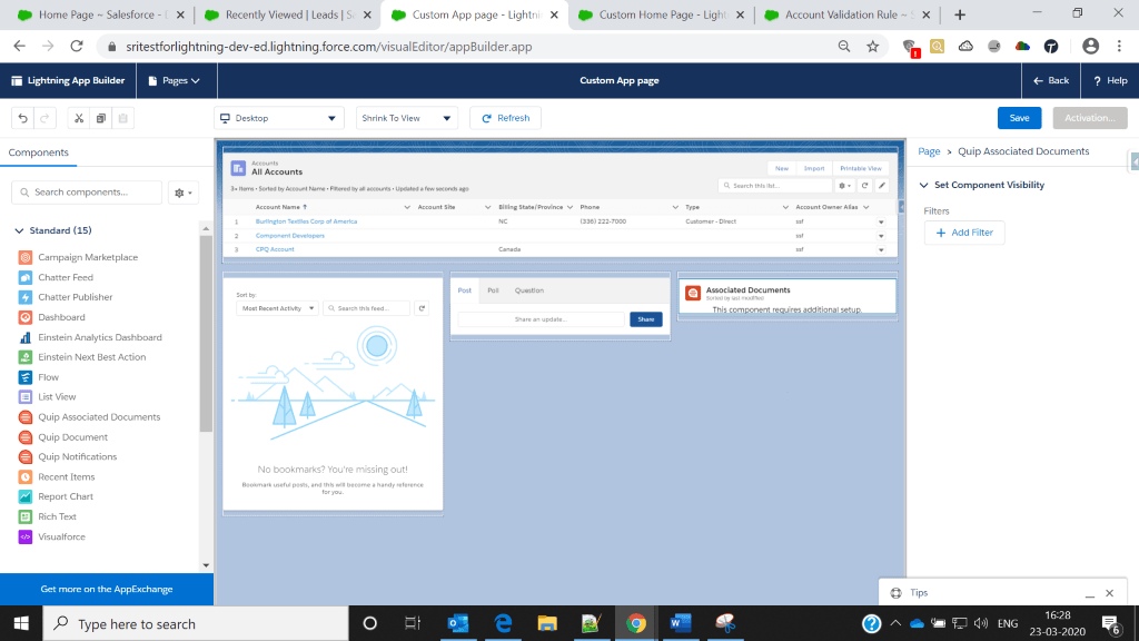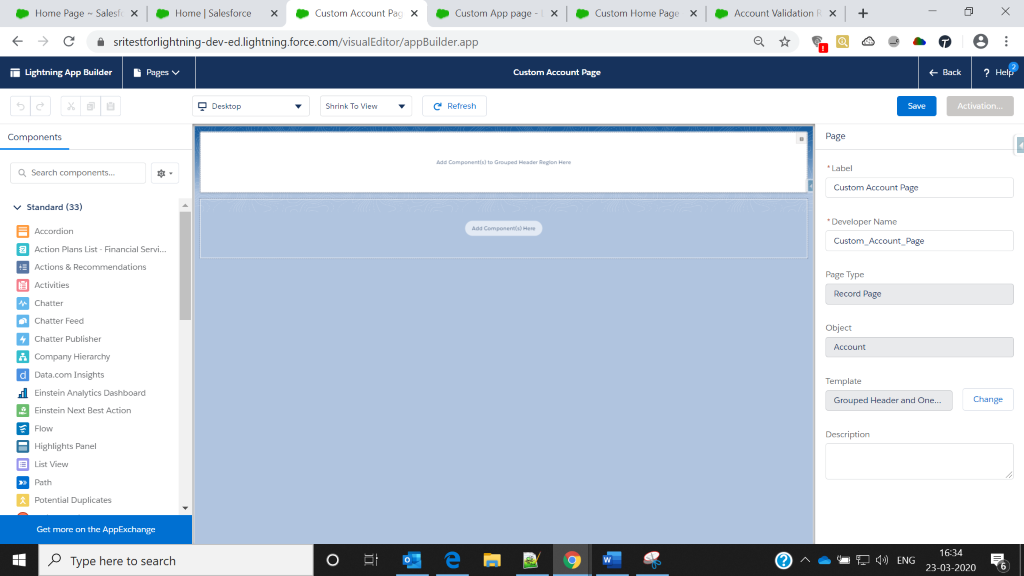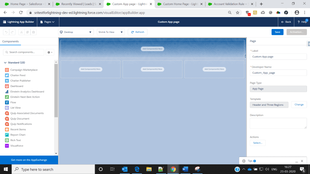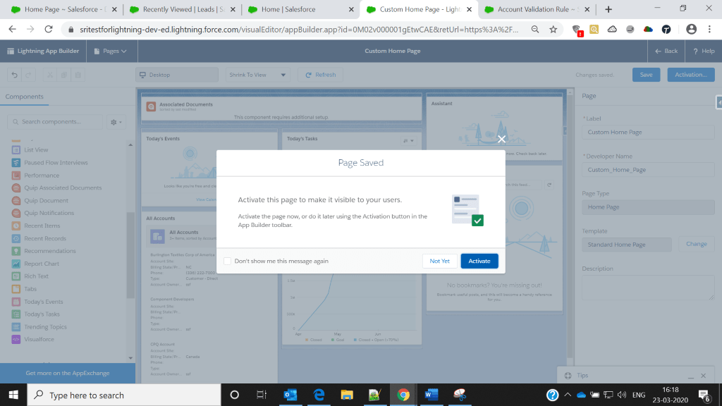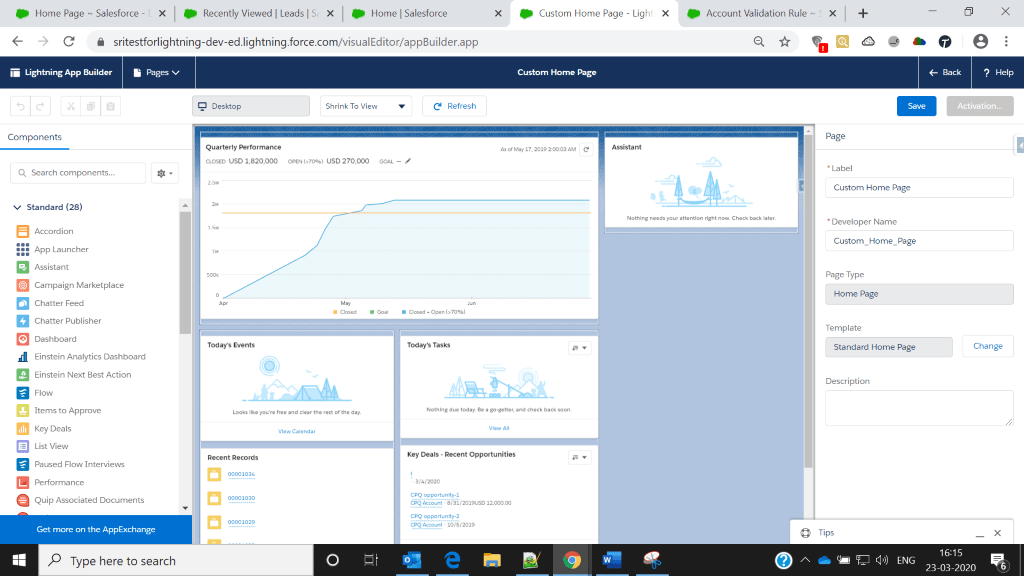 - The home page template will open in the Lightning App builder in Edit mode. This page contains all the standard and custom components we have installed in our org.