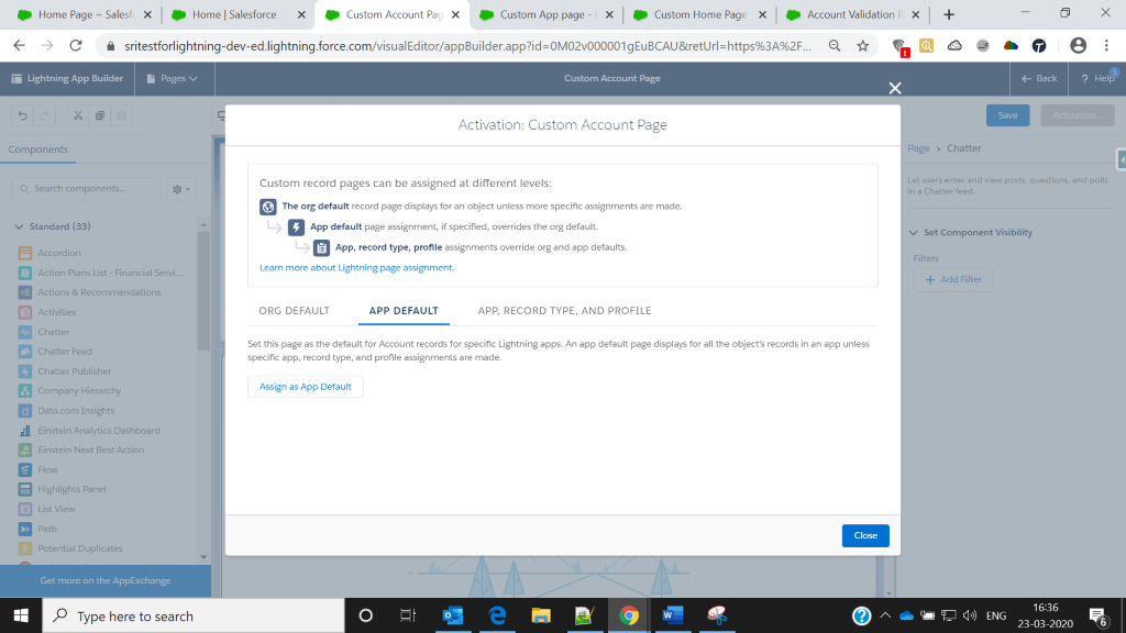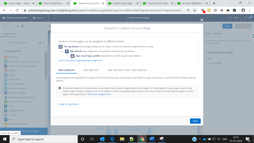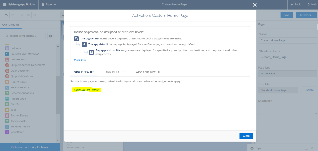 We can assign Record page to either ‘Org Default’ (record page will be visible to all the users)or ‘App default’ (record page will be visible to only particular app users) or to ‘App, record type and Profile’ combination (record page will be visible only to particular App, record type and profile users only). Select an option depending upon the requirement. Read relevant blog: Benefits of Lightning Web Components Over Aura Lightning Components