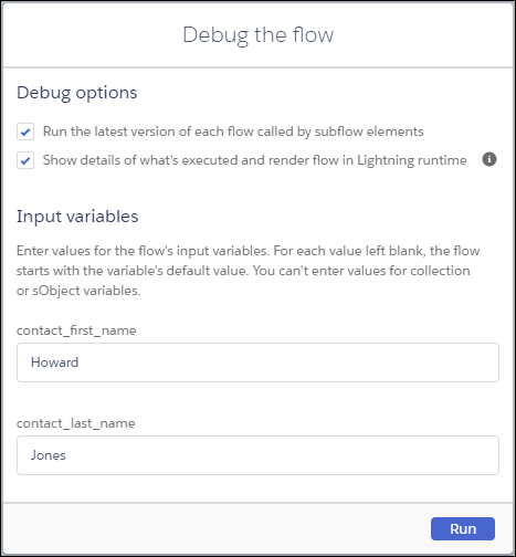 - Debug a Flow in Flow Builder: “Debug” feature on the flow is a great way to begin testing. You need to set the debug options , input variables and when we run ‘Debug Details’ appear in a panel on the right.