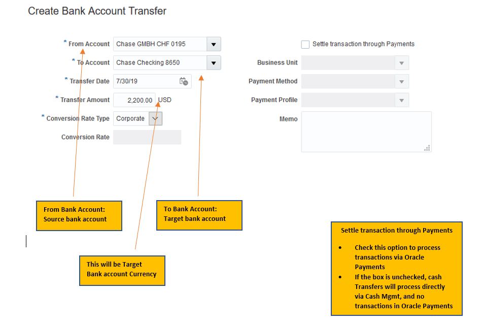 Conversion rate type will be defaulted from the Source bank account’s Bank Exchange Rate type. Source bank account should be multicurrency bank account if transfer amount is different than Target Bank account currency.