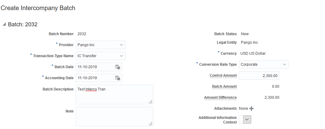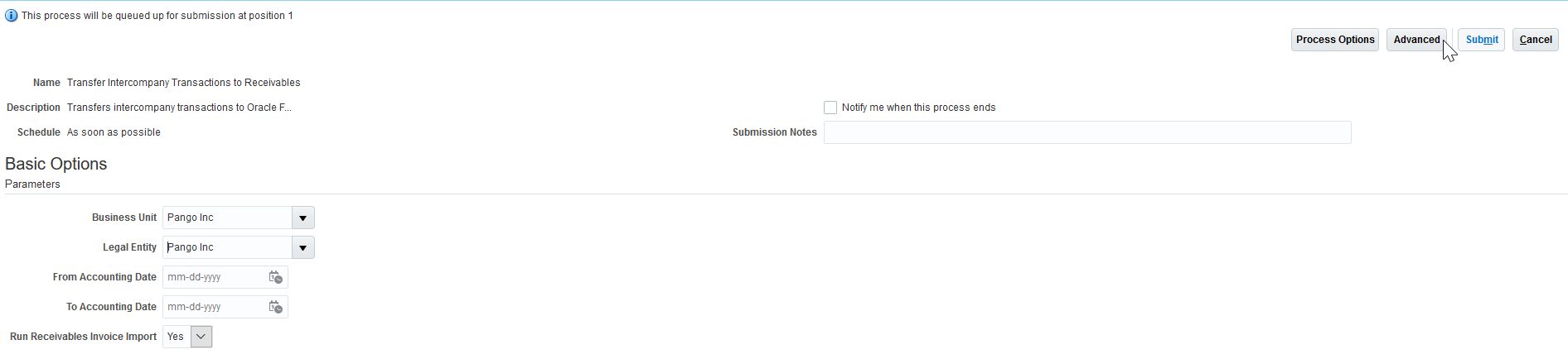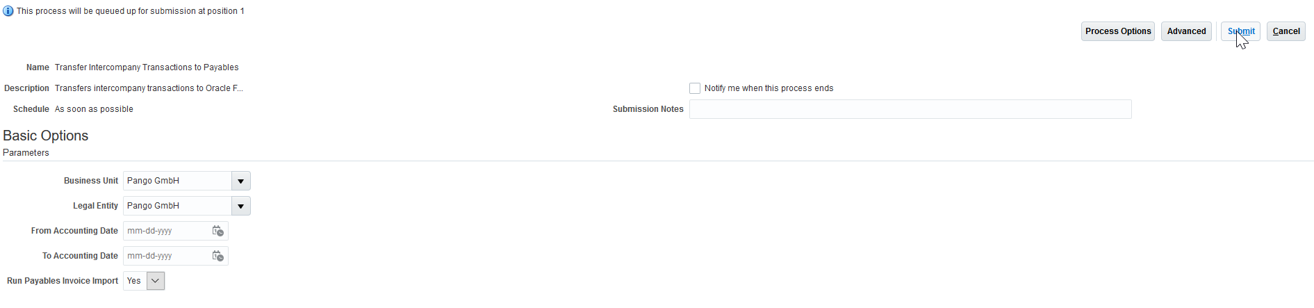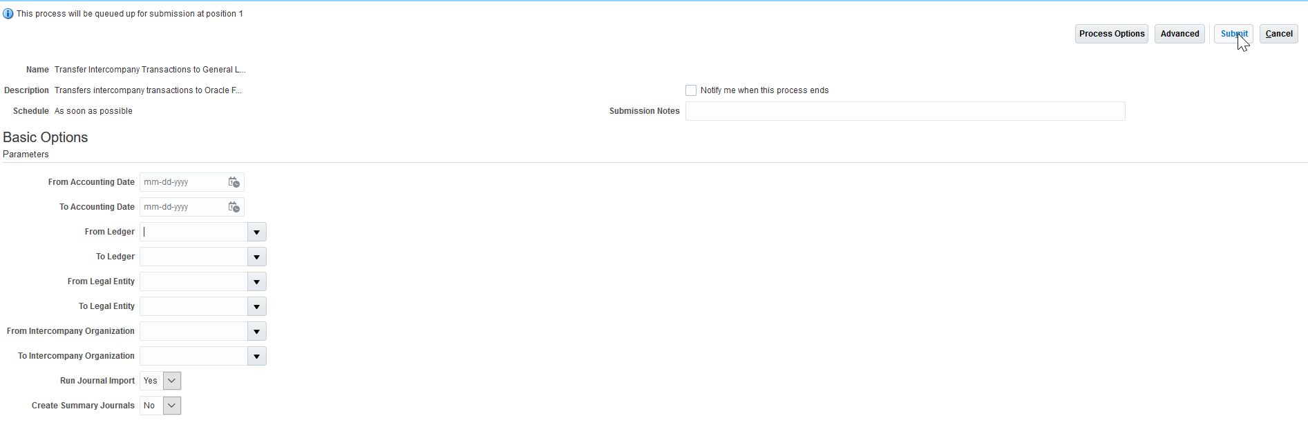 Note: Do not enter any parameter, this will transfer all intercompany transactions entered within various ledgers(companies).