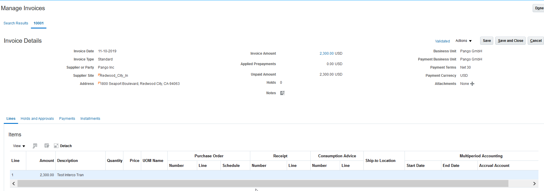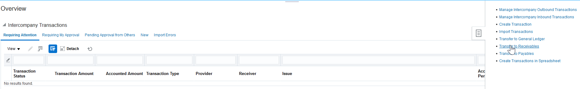 Initiator workflow transfers the intercompany transactions to Receivables module to create AR invoices as required by legal or business requirements. After creating the invoices, Receivables updates the intercompany transactions with the invoice numbers and passes the number to the recipient workflow, which updates and transfers the transaction to Payables.