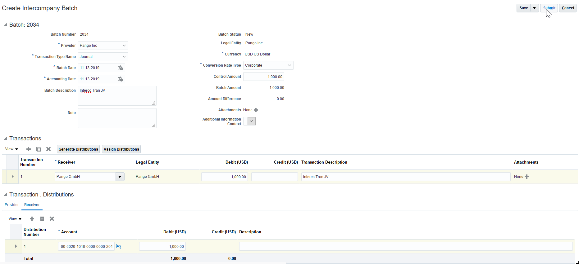 Enter Business Unit (Receiving company), Legal Entity, and Submit it