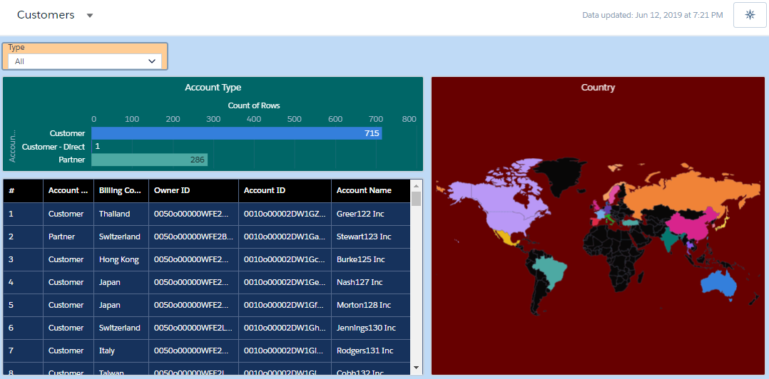 Users can see 20 records from the dataset. These records show the Account data, including AccountId, Account Name, and Account Source.