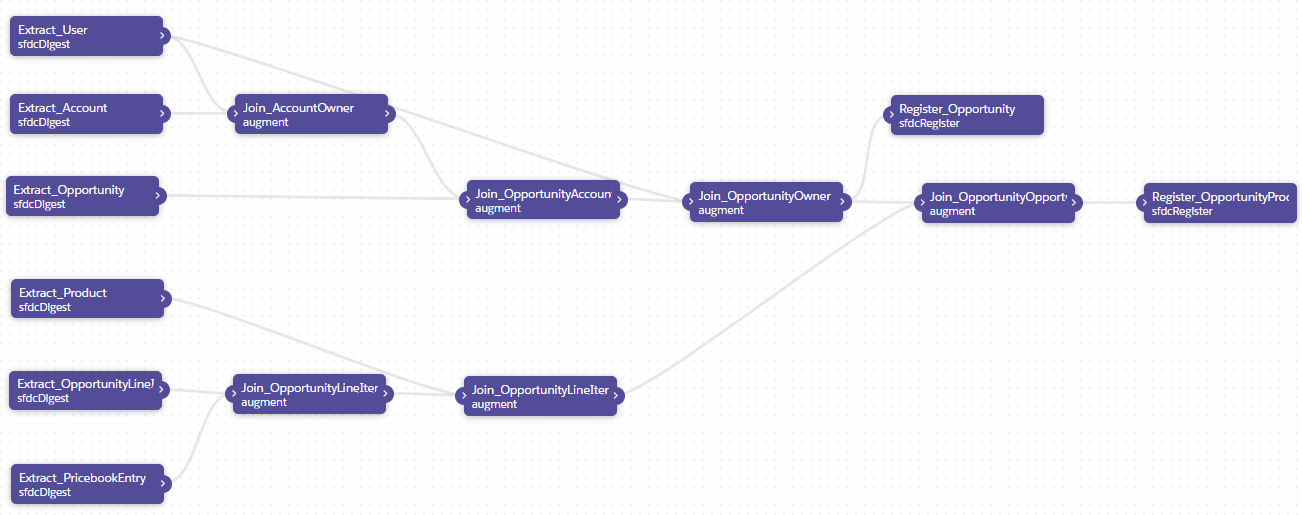 A Dataflow is a chain of connected nodes for data transformation to build Datasets. Ideally, we should start with getting data for transformation from the existing dataset, any Salesforce object, or any external data. Each data transformation node has specific functions, from getting data, augmenting, computing, to registering, etc. As per the dashboard requirements, we can craft the dataflow to orchestrate data transformation and the result of dataflow creates Datasets for the dashboard.