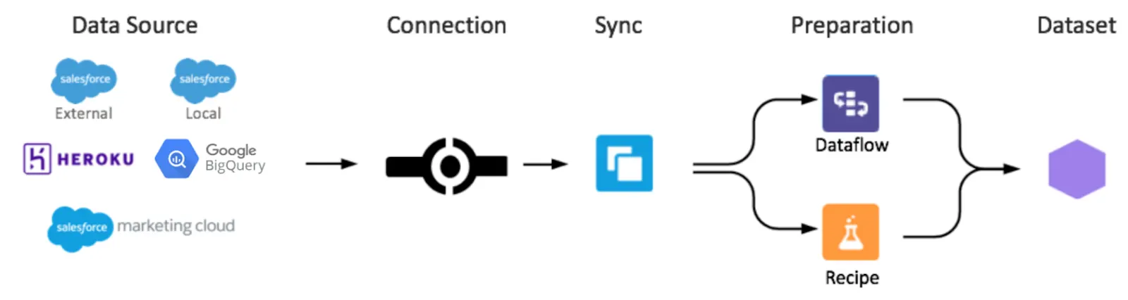There are multiple options for loading data into Salesforce Einstein Analytics – directly from Salesforce objects, a Salesforce report, manually loading data using a CSV file, or external data sources, including other Salesforce Orgs.