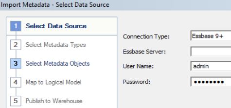 - To connect Essbase from OBIEE, open the OBIEE Administration tool and select “File” -> “Import Metadata” option and provide details of the Essbase server as below. Provide only the hostname of the Essbase server without the port number if the Essbase agent is running on the default port; otherwise server name should be appended with a colon and the specific port number.
