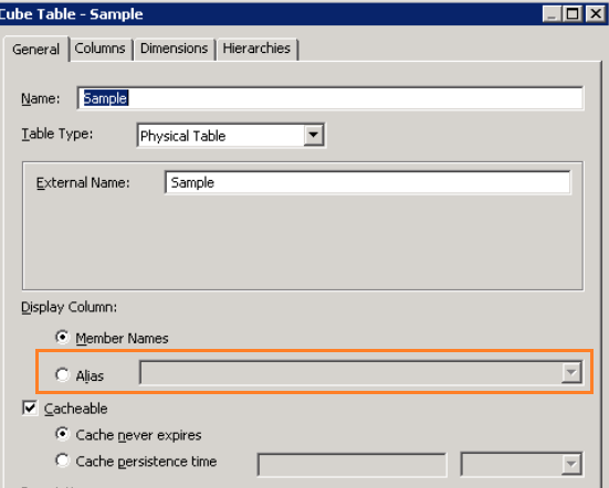 - To switch from member names to alias, you can go to the cube table options as shown below, which appears after double-clicking on the cube name.