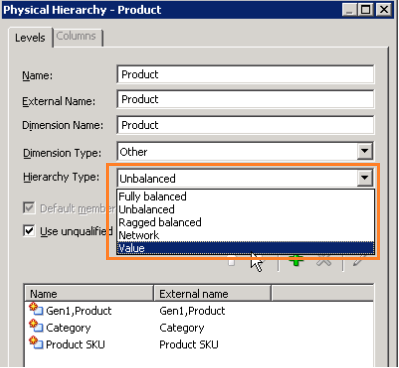 Selection of Hierarchy typesMultiple hierarchy types can be selected based on the nature of the hierarchy. E.g., Value type can be selected if it is Parent-Child nature and the levels frequently change in the outline.