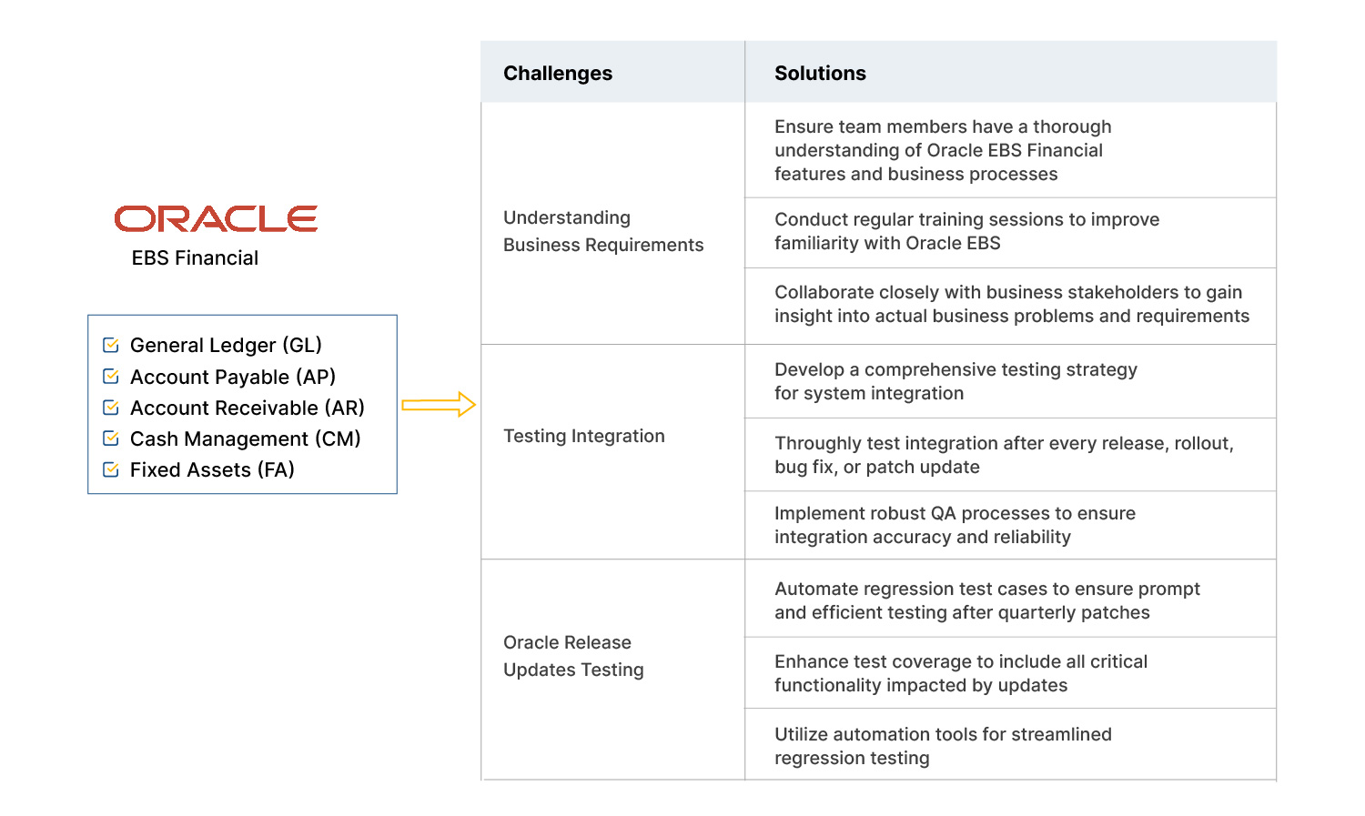 Integrating third-party services into Oracle EBS Financials can be a complex process, and testing this integration comes with its own set of challenges. The challenge is to ensure seamless communication and data exchange between Oracle EBS and third-party applications while maintaining integrity and performance.