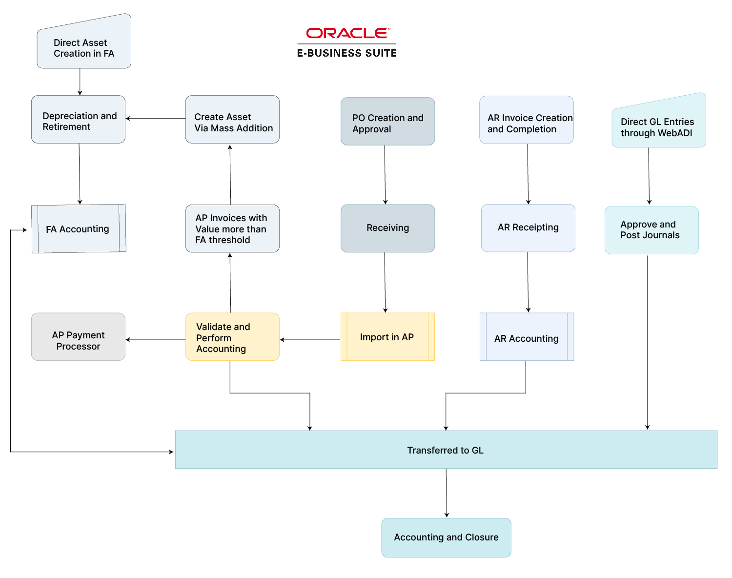 In the Accounts Payable (AP) module, data flows from the Purchasing module through the Payables Open Interface process, subsequently undergoing validation and accounting processes in AP to facilitate payments through the Payment Process Request (PPR). Moreover, AP invoices categorized as asset creation trigger the Mass Addition program, initiating the creation of assets, which then undergoes the standard depreciation process.