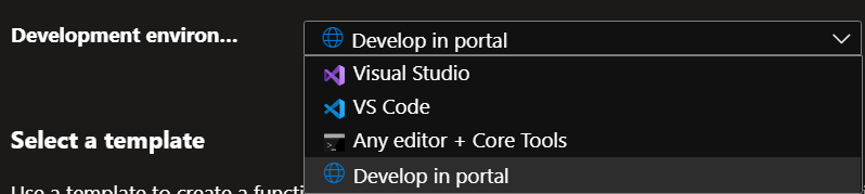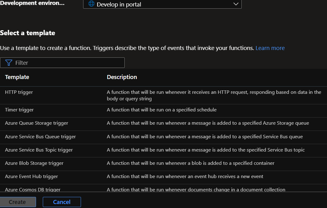 If we opt to develop a function in the portal, the second step states, ”Use a template to create a function. Triggers describe the type of events that involve your functions”.