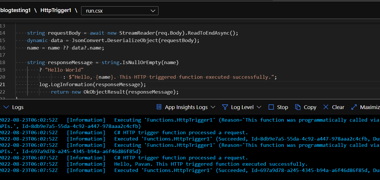 We can write the code, and trace information is recorded in the logs as soon as your function executes.