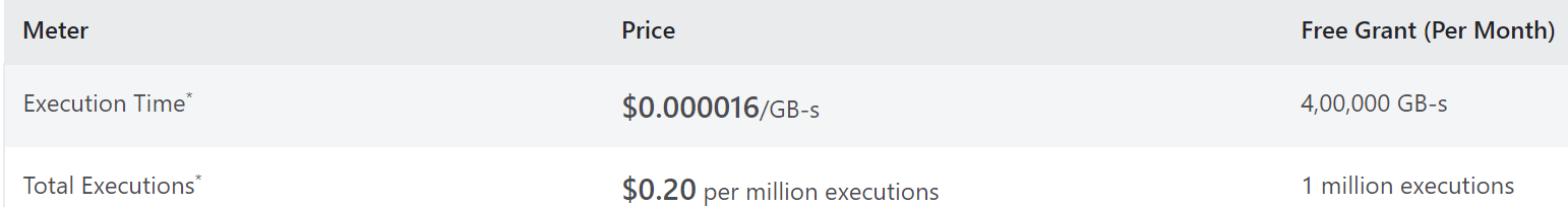 Pay-Per-Use Pricing Model: The consumption plan is invoiced based on resource use and executions per second (different plans offer features for special needs). The image provided below indicates the price for the consumption model.