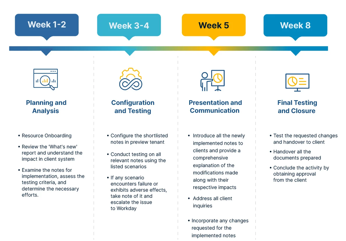 - Release Review and Analysis: Through in-depth evaluation of Workday updates, we identify mandatory feature changes and their implications for your organization.