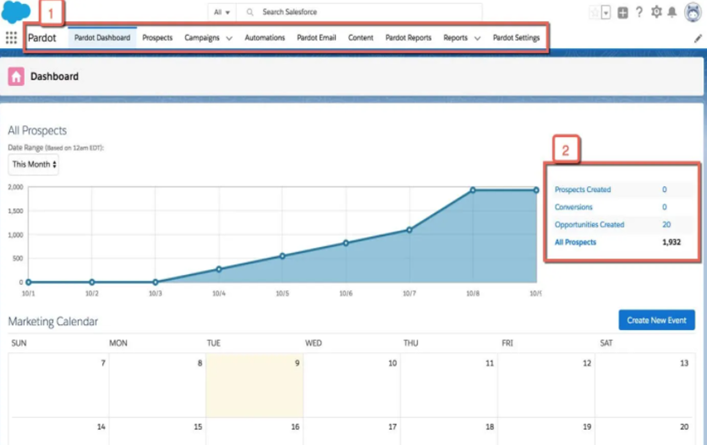 The Pardot dashboard is the first thing we see after logging into Pardot. The pardot navigation bar contains eight main menu items by default listed below: