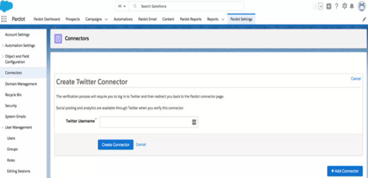 Let us set up a Twitter connector in Pardot, and we can follow the same steps for other applications too: