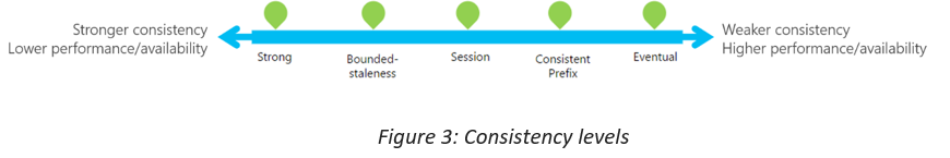 Azure Cosmos DB contains five consistency models. Each consistency level provides availability and performance trade-offs to help you decide which consistency matches your scenario.